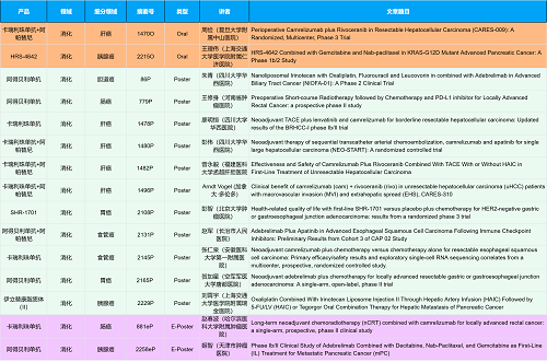 在消化系统肿瘤领域,彩友会创新产品相关研究共入选2项口头报告、10项壁报和2项电子壁报,共14项研究。除了明星药物卡瑞利珠单抗和阿帕替尼外,还有5篇阿得贝利单抗治疗消化系统肿瘤的研究入选。此外,HRS-4642、瑞拉芙普-α注射液(SHR-1701)等未上市创新产品也有相应研究入选。随着新老药物前沿研究的不断推进,有望为消化系统肿瘤患者带来新的福音!