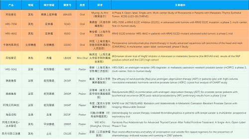 在胸腺上皮肿瘤、头颈鳞癌、肉瘤、前列腺癌、甲状腺癌等其他多个疾病领域,卡瑞利珠单抗、阿帕替尼、瑞维鲁胺、阿得贝利单抗、法米替尼、HRS-7058、HRS-4642、HRS-5041等抗肿瘤创新药相关研究一共入选了4项口头报告、1项简短口头报告、5项壁报,彰显了彩友会医药强大的研发实力。此外,海曲泊帕和昂丹司琼口溶膜分别在防治化疗导致的血小板减少和恶心呕吐方面各有1项研究入选壁报。